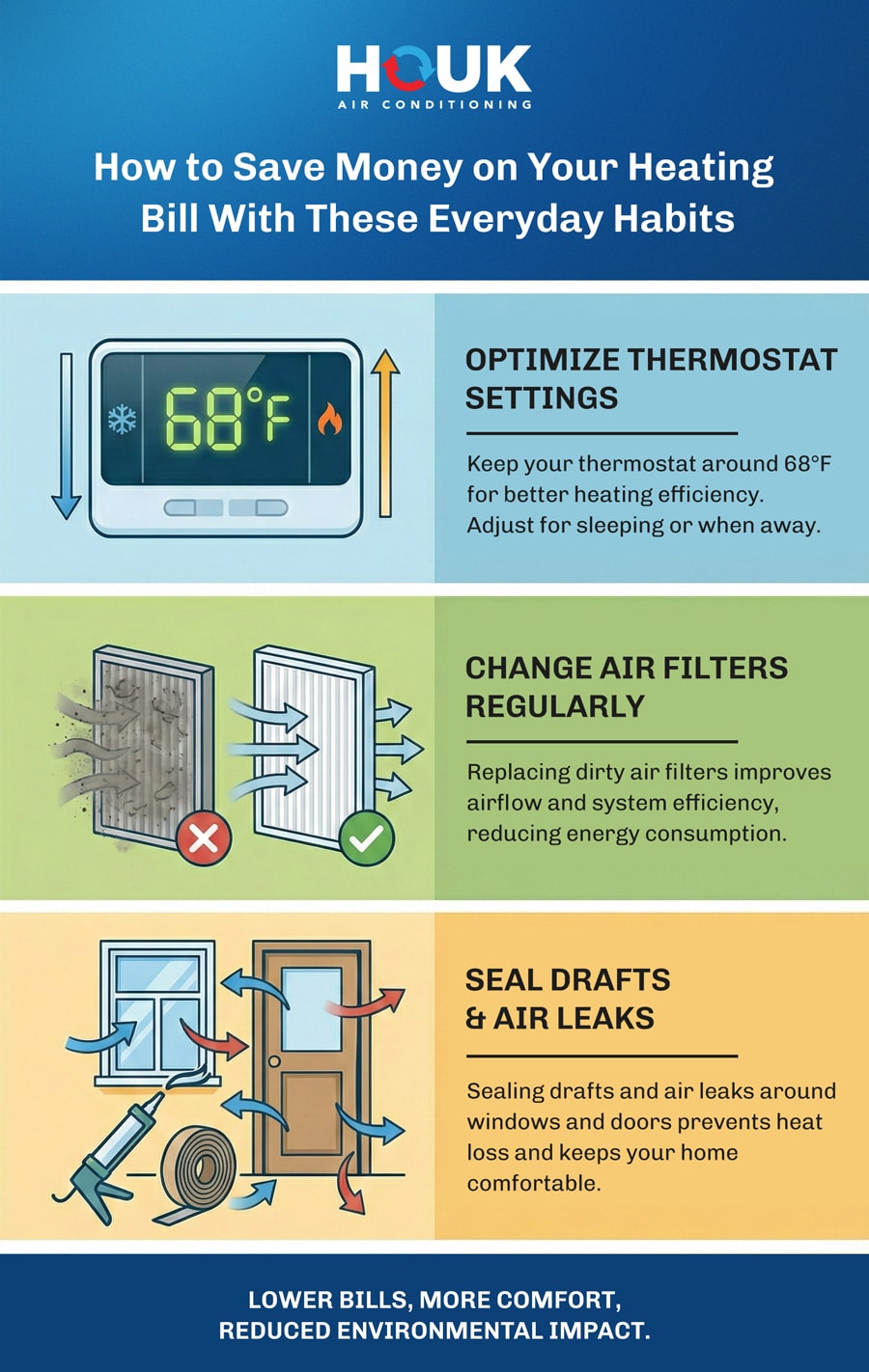 - Small habits like keeping your thermostat at 68°F and changing your filter monthly can meaningfully reduce your bill
